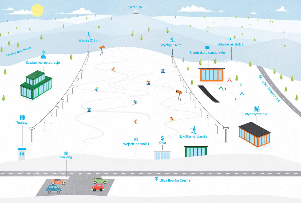 Szkolimy na stoku Pietkiewiczówka, który znajduje się przy ulicy Turystycznej 11. W ramach ośrodka funkcjonują dwa wyciągi orczykowe: 232 metry, a także 218 metrów.